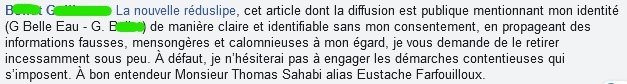 B. G. nous somme de retirer l’un de nos articles parce que sa « diffusion est publique […] propageant des informations fausses, mensongères et calomnieuses à son égard ».