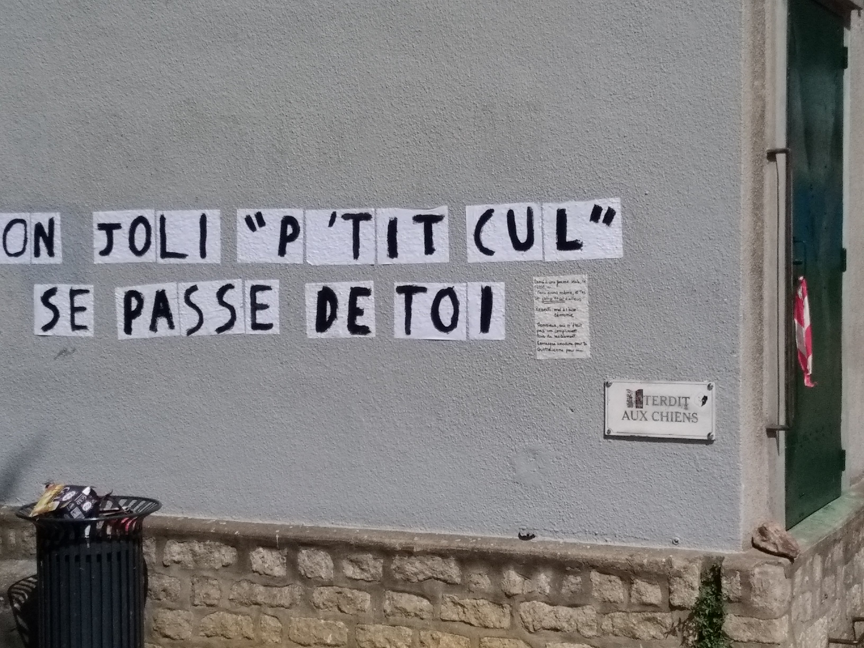 Le 17/08/2020, une femme s’est faite harceler dans le square du pont Joubert « T’as un joli petit cul » lui a-t-on dit. En réplique à cela, le surlendemain un groupe féministe a affiché « mon joli petit cul se passe bien de toi », sans aucune détérioration du mur du compteur électrique, puisque cela a été collé sur du papier avec une colle à papier peint biodégradable et hydrosoluble.