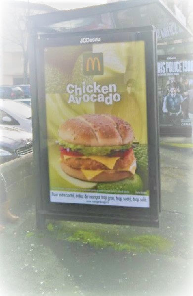 Première publicité que l’on peut voir en ce moment en ville, une publicité pour le Chicken Avocado. Un burger d’une célèbre marque au M. Alors ici, j’imagine que c’est un hommage à Yanick Jadot, l’écolo qui mange à McDo avec ses enfants. Au delà de cet évident hommage à cet artisan du changement du monde, futur sauveur de la nation, qui par son alliance avec Benoit Hamon lors de la précédente présidentielle a permis à Macron d’être président, il y a bien sûr le soutien à une petite chaine de restaurant, où l’on produit une nourriture de qualité dans le respect de l’environnement et de la santé des gens. Pour s’en convaincre, je vous renvoie à la lecture ici ou là pour la santé et ici pour l’environnement !