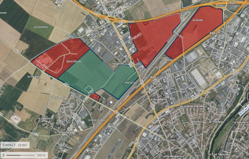 Si l’on regarde la PPI (programmation pluriannuelle d’investissement 2022-2028) du Grand Potiers quatre millions d’euros, 4M€, sont prévus pour l’alimentation. La sanctuarisation des 72ha en font partis. Mais si l’on regarde la carte présentée dans l’article de CentrePresse, on peut voir que cette sanctuarisation est située dans une zone connue de certains et certaines des plus radicales militantes écologistes de Potiers et de ses environs. Je parle bien entendu de République IV, ou comme elle s’appelle maintenant dur « Parc d’activités éco-industriel Aliénor d’Aquitaine Poiters Nord ». Regardons de plus près ce somptueux sanctuaire :
