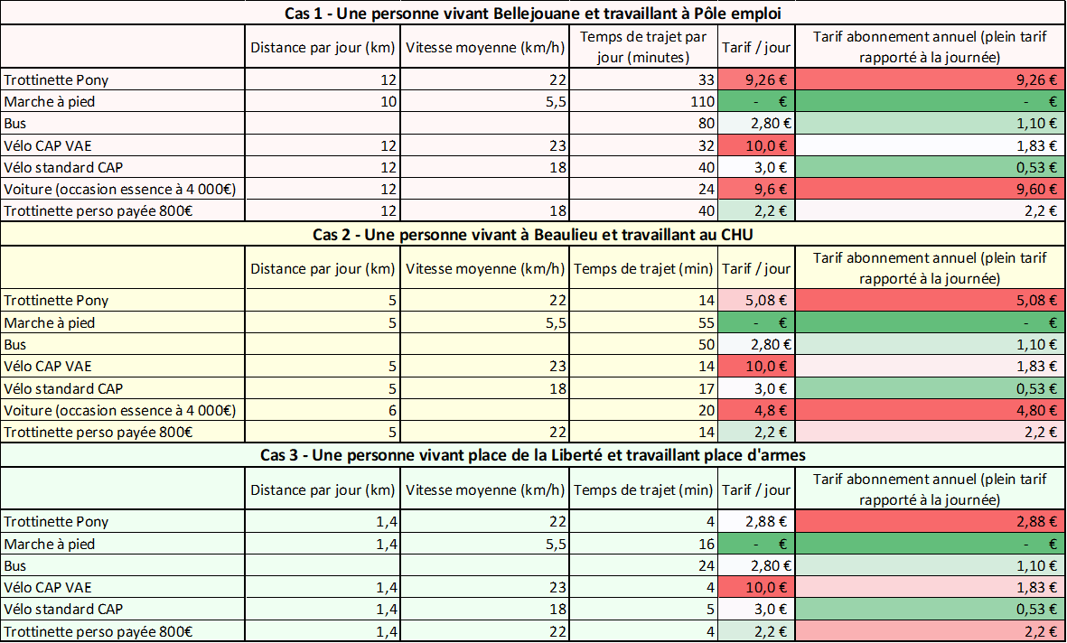 Vous l’aurez compris, cette enquête révèle que ce service de trottinette en libre-service (qui n’a de libre que le nom puisque les tarifs sont exorbitants !!) est un « service » qui a une utilité toute relative. En effet, Poitiers et Grand Poitiers offrent déjà des alternatives via les vélos CAP ou aux bus Vitalis qui seront presque toujours moins chères à la journée et toujours moins chères lorsque vous prendre un abonnement annuel. Pour résumer la situation, Crash Investigation a réalisé le tableau suivant, présentant la situation de 3 personnes fictives qui ne vivent que pour travailler et sans loisirs, ne sortant de chez elles que pour aller au travail. L’hypothèse pour la voiture, est une voiture essence achetée à 4000€ d’occasion, une assurance auto à 20€ par mois et des frais d’entretien classiques, avec une durée de vie pour la voiture estimée à 5 ans seulement et un prix de l’essence à 1€90 le litre de SP95. Les projections de Crash Investigation nous permettent donc de voir que dans les 3 scénarios envisagés ici, la trottinette de Pony est toujours ou presque la solution la plus chère, même avoir une voiture est moins cher…