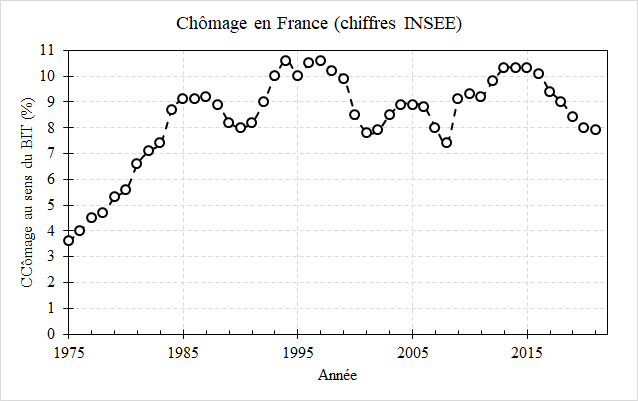 Premièrement, cette réforme fait suite à la réforme précédente de 2019. Le gouvernement réforme donc sa propre réforme sur les droits au chômage, cette dernière ne semble donc pas satisfaisante à son goût, cocasse. Lisons ensemble ce qui est prévu : « Le nouveau régime annoncé, qui sera intégré dans un décret et applicable du 1er février au 31 décembre 2023, prévoit une baisse de 25% de la durée maximum d’indemnisation lorsque le taux de chômage est en-dessous de 9% ou qu’il ne varie pas de +0,8 point en un trimestre. » Pour le gouvernement, un taux de chômage faible est situé en dessous de 9%. Pourtant, pour le BIT, le « plein emploi […] à un taux inférieur à 5 % au sens du BIT. Il n’existe alors pas de difficulté particulière à trouver un emploi ». Nous pouvons donc constater que pour le BIT, au-dessus de 5% de chômage, il existe des difficultés générales à trouver un emploi. Le gouvernement fait donc le choix de ne pas aligner sa définition de ce qu’est une conjoncture favorable avec celle du BIT. Si nous regardons maintenant les chiffres fournis par l’INSEE, qui calcule en France le taux de chômage au sens du BIT par une enquête trimestrielle depuis 2003, annuelle avant cette date. Nous constatons que le taux de chômage est situé entre 7 et 11 pourcents, depuis 1982. Nous sommes, effectivement revenus au taux le plus bas depuis 1982. C’est historique ! Mais ce n’est toujours pas le plein emploi, il subsiste donc des difficultés à trouver un emploi. On se demande donc pourquoi le gouvernement a choisi 9% comme limite de taux favorable, sachant que sur les 47 années étudiées ici, seules 19 sont au-dessus des 9%, et seulement 4 en dessous de 5% et donc considérées en plein emploi.