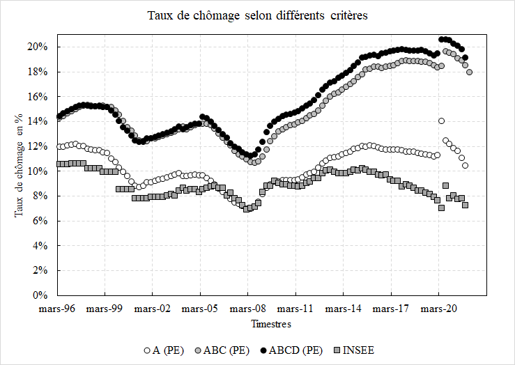 Nous pouvons constater que la catégorie A du Pôle Emploi (ronds blancs) et le taux de chômage calculé par l’Insee (carrés gris) sont très semblables entre 1996 et 2015 (moins de 1% d’écart) avant d’atteindre un écart de près de 2% en ce moment. Si le chômage diminue au sens du BIT et de l’Insee depuis 2016, il reste bien plus stable pour le Pôle Emploi, avec une nette baisse cependant ces derniers mois? Cependant, pour le Pôle Emploi nous sommes loin d’être revenu au niveau bas atteint fin 2007 début 2008. C’est encore plus criant si l’on prend en compte les chômeurs de catégories B, C et D. Le taux de chômage en France, n’a jamais été aussi haut qu’aujourd’hui, et ce taux est stable depuis 2016, autour de 18% pour les catégories ABC et 20% pour les catégories ABCD. Le taux calculé par l’Insee a baissé, mais cela est probablement dû à des effets de comptabilisation qui n’ont pas de traduction dans le monde réel.