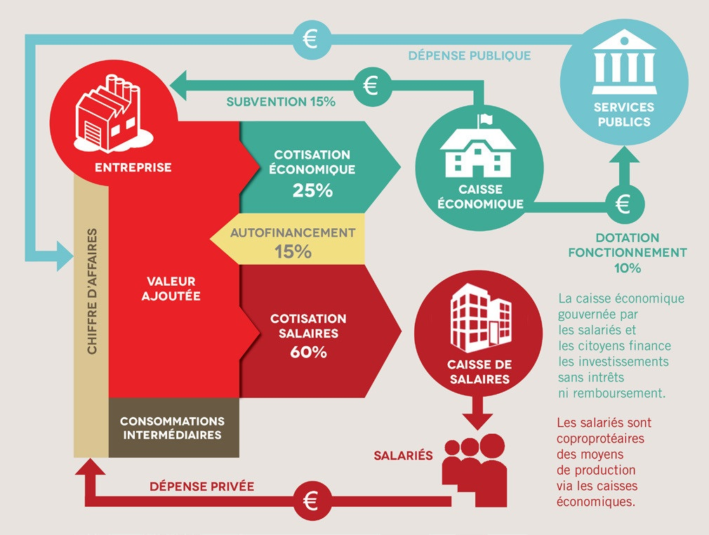 Pour rappel, en France, une heure de travail produit 70€ de richesse en moyenne. Le salaire horaire médian brut en France est de 15€ de l’heure, le moyen est de 18€ de l’heure, si on y ajoute les 30% moyens de cotisations patronales on obtient environ 24€. Le capital nous vole notre richesse produite, en moyenne 46€ par heure que nous travaillons. Pour chaque heure travaillée en moyenne dans ce pays, 46€ disparaissent de nos poches et des cotisations. En moyenne, nous recevons 24€ par heure de travail, soit en salaire direct, soit en cotisations et impôts qui alimentent notre salaire indirect (sécurité sociale, allocation chômage…). Le Réseau Salariat suggère que 30% du profit est directement attribué au profit. De mon côté et si on reprend les chiffres que j’ai avancés plus avant, nous sommes autour de 66% des bénéfices liés au travail vont dans les poches du capital (ce dernier pouvant s’acquitter d’impôts, régler ses factures, payer ses loyers, acheter du matériel ou se verser des dividendes). Pourtant ce qu’il faut faire est assez simple, le salaire à vie version Friot.