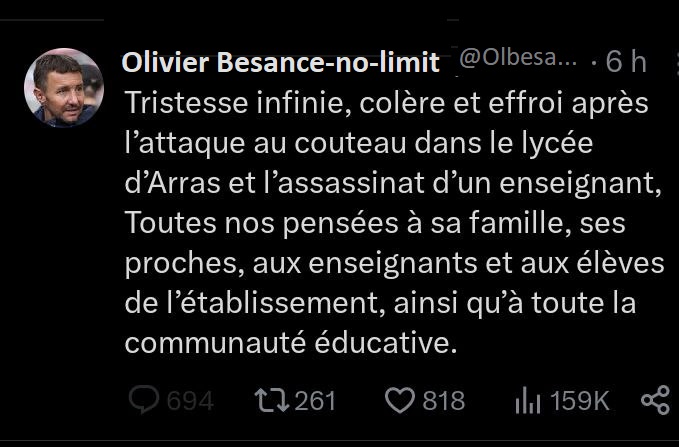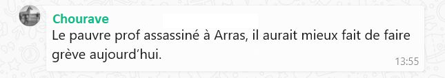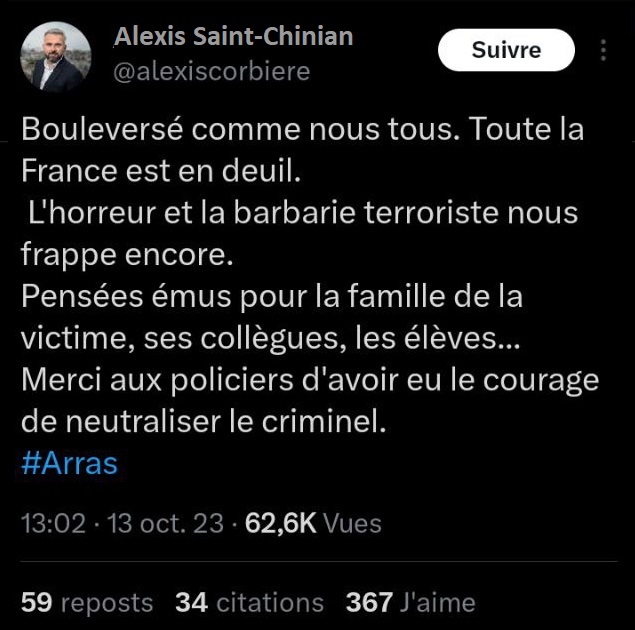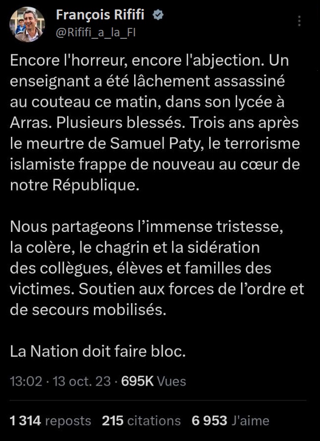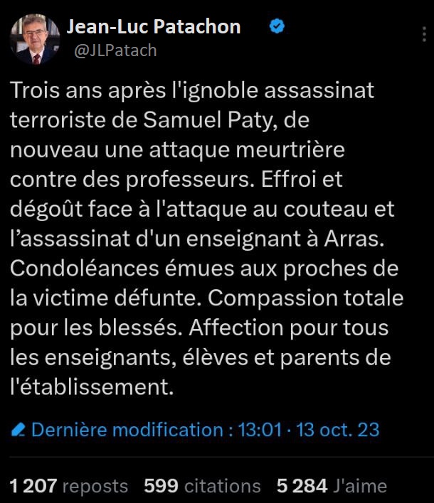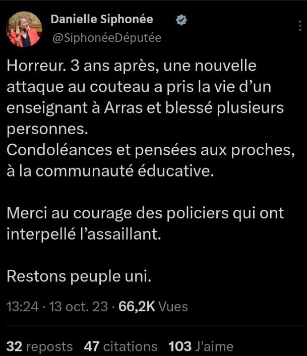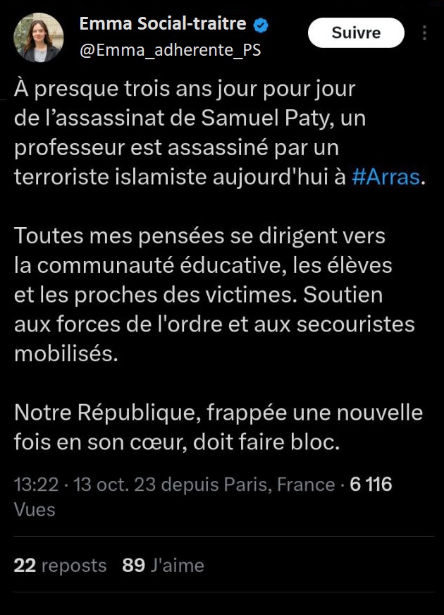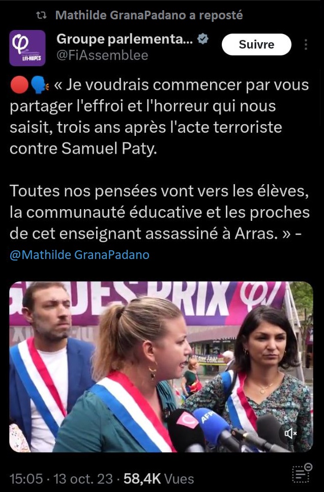 « pensées émues », « soutien à la communauté éducative », « 3 ans après Samuel Parti », « mes pensées vont au proches de la victime » ces termes reviennent dans toutes les déclarations qui suivent ces événements tragiques. Un exemple avec les députés Jean-Luc Patachon, François Rififi, Alexis Saint-Chinian, Danielle Siphonée, Clémentin Hautaine de LFI (La Force Inaudible), mais aussi Olivier Besance-no-Limit du NPA (Netanyahou n’est Pas notre Ami), ou une députée lambda du PS (Parti Socialtraitre).