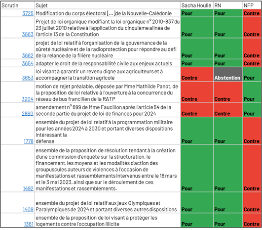 Le vote 1778 porte sur « l’ensemble du projet de loi relatif à la programmation militaire pour les années 2024 à 2030 et portant diverses dispositions intéressant la défense ». Sur les questions de défense, le RN et la macronie sont en accord. Monsieur Houlié vote en cadence avec le RN sur les sujets liés à la défense nationale. Cette adhésion du RN au projet de Macron sur les questions de défense, illustre la nature particulièrement guerrière du locataire de l’Élysée et devrait nous inquiéter quant à un possible penchant sécuritaire et autoritaire. Bien sûr le NFP sur le sujet ne partage pas du tout les mêmes positions et avait voté contre.
