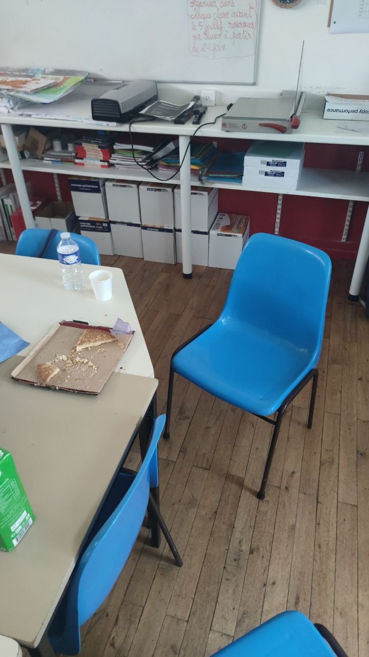 Nous précisons que la photo a été prise apres son passage et cette photo révèle deux choses. Premièrement l’ancien maire est malpoli puisque qu’il ne remet pas la chaise sous la table en quittant la salle. Deuxièmement le broyé était entier et il n’en reste que 19 % après son passage.